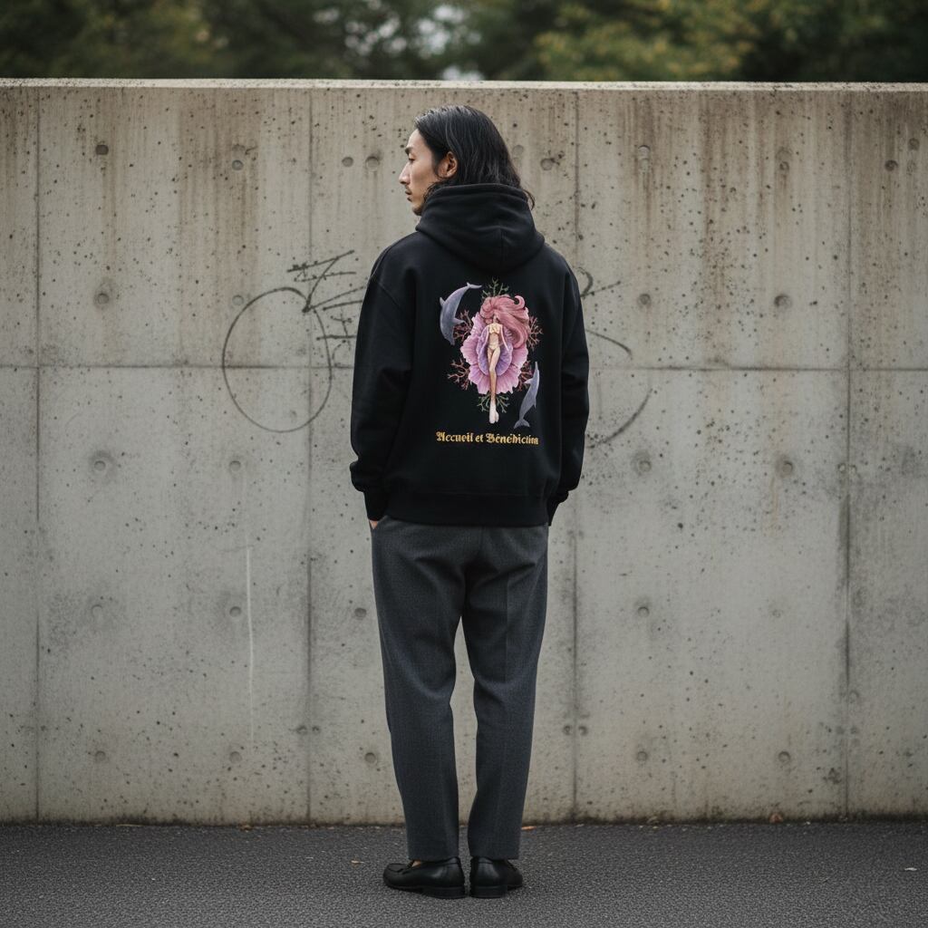 あえて正面には何もデザインせず、背中に大きくプリントすることで、静けさとダイナミックさを併せ持たせた一枚です。